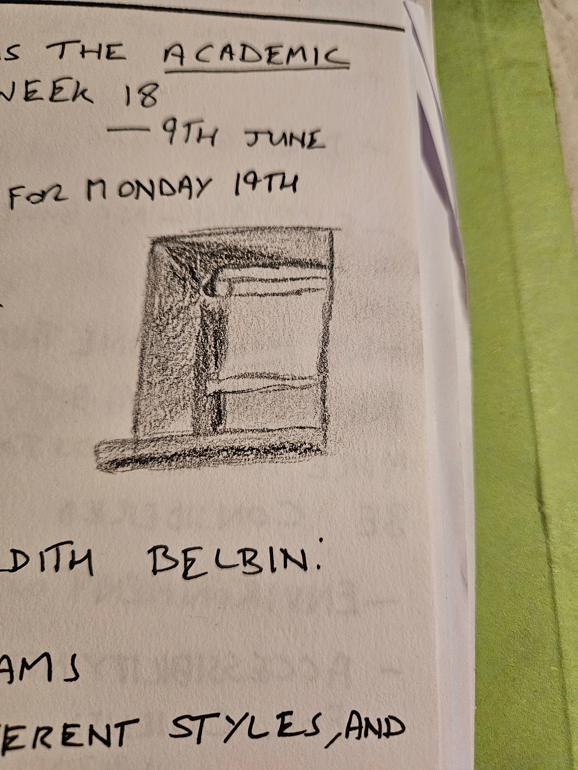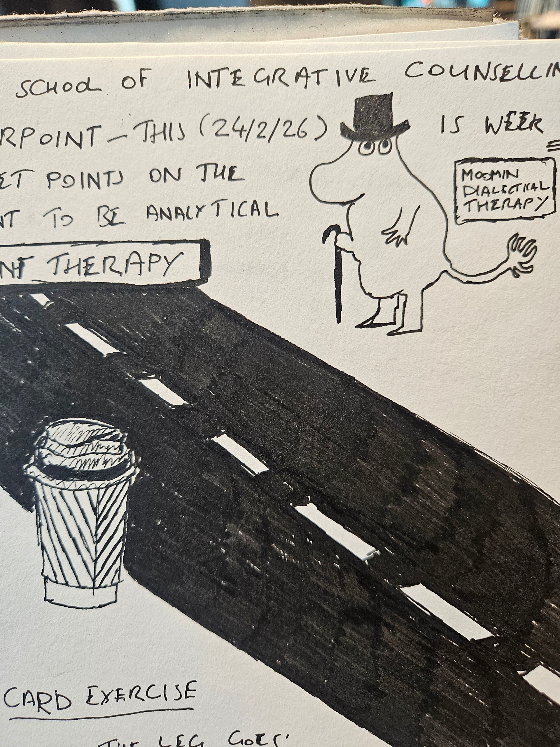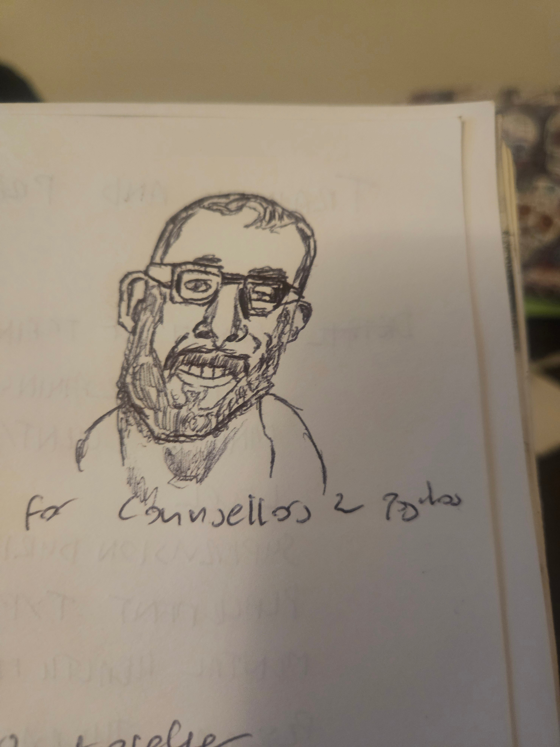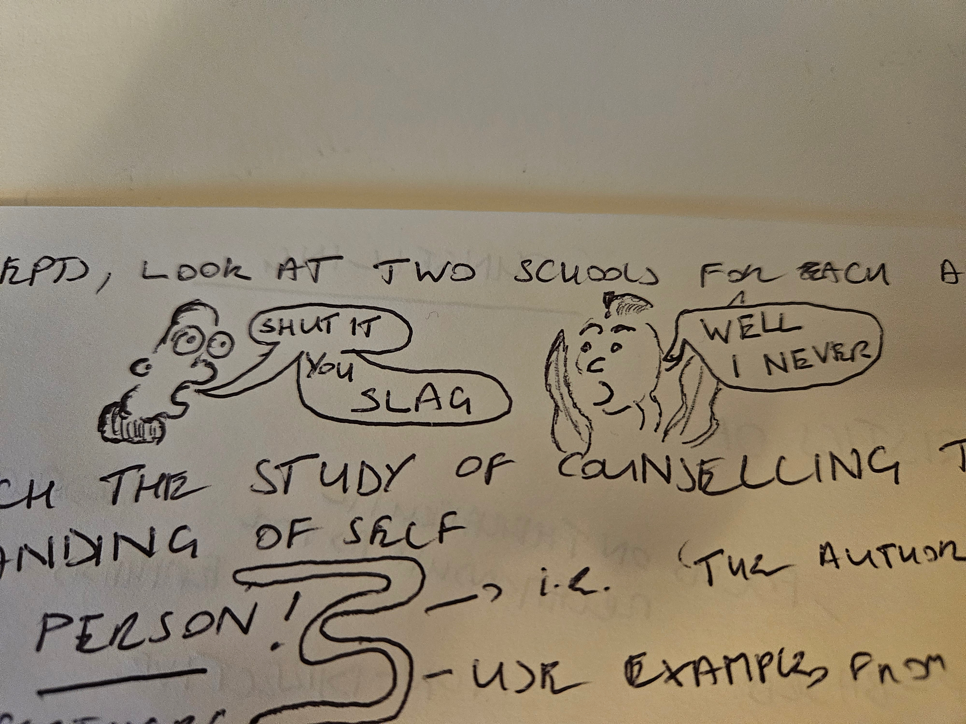 I do a lot of doodling when I’m making notes on the counselling course I’m doing. Here’s the window of the classroom, and a little guy with 90s hair carrying an HMV bag.