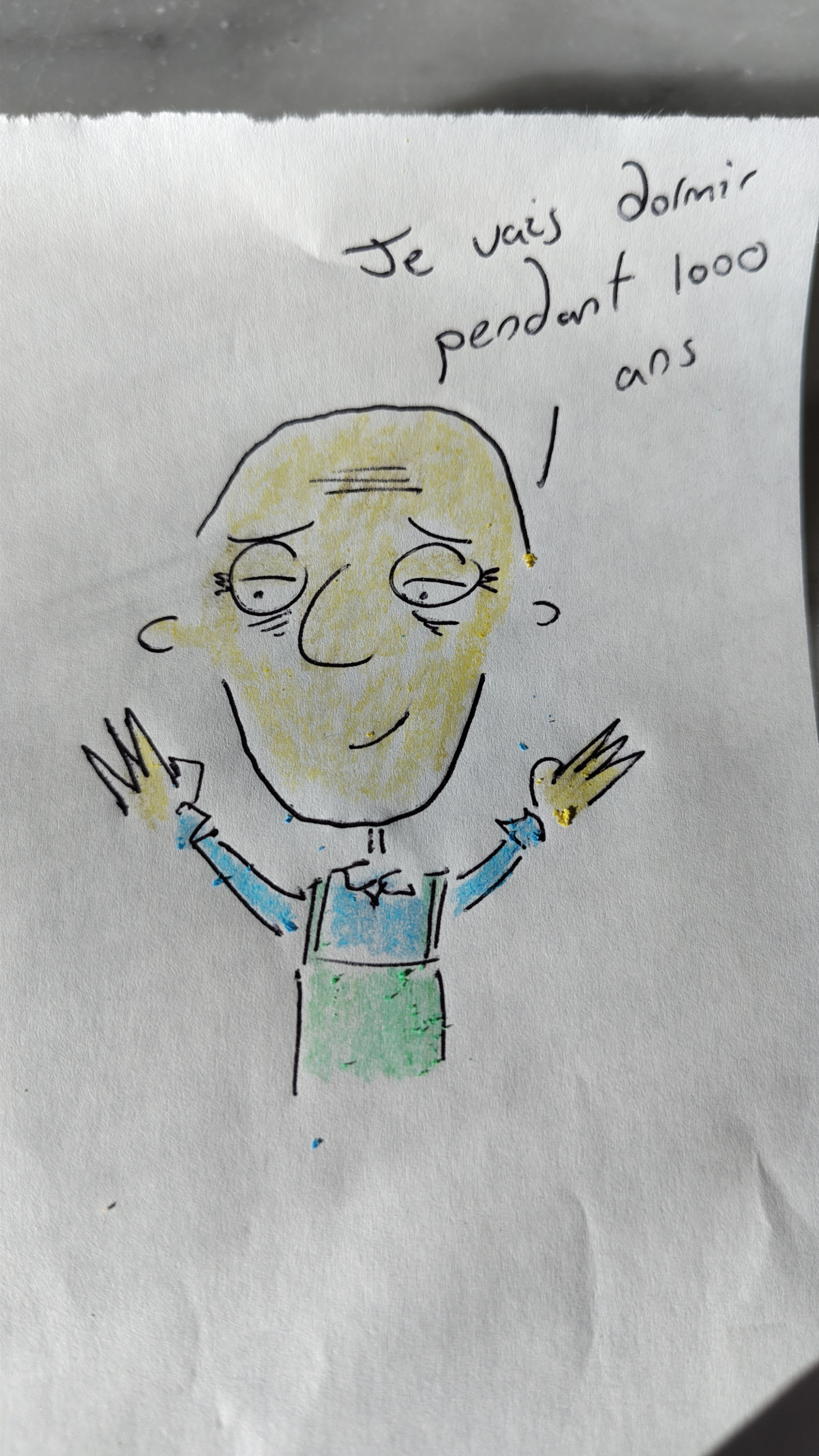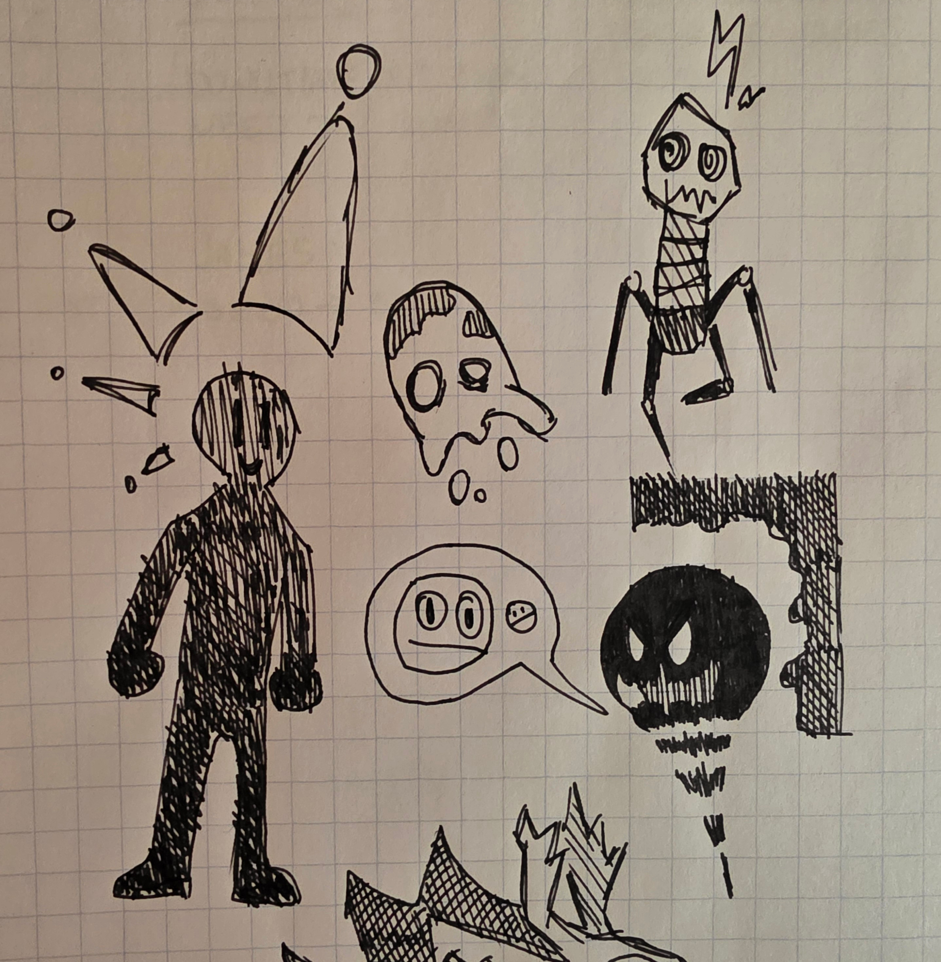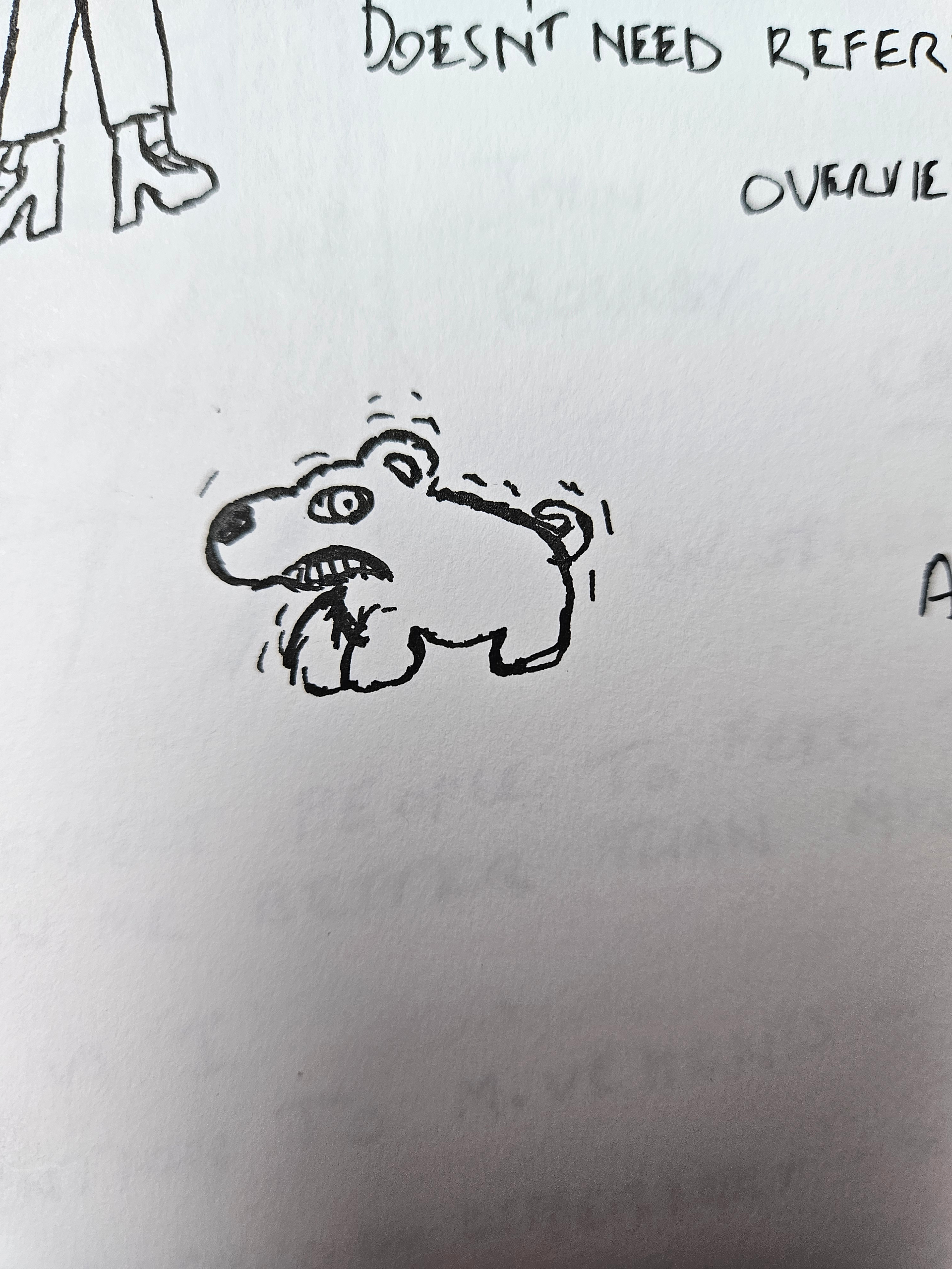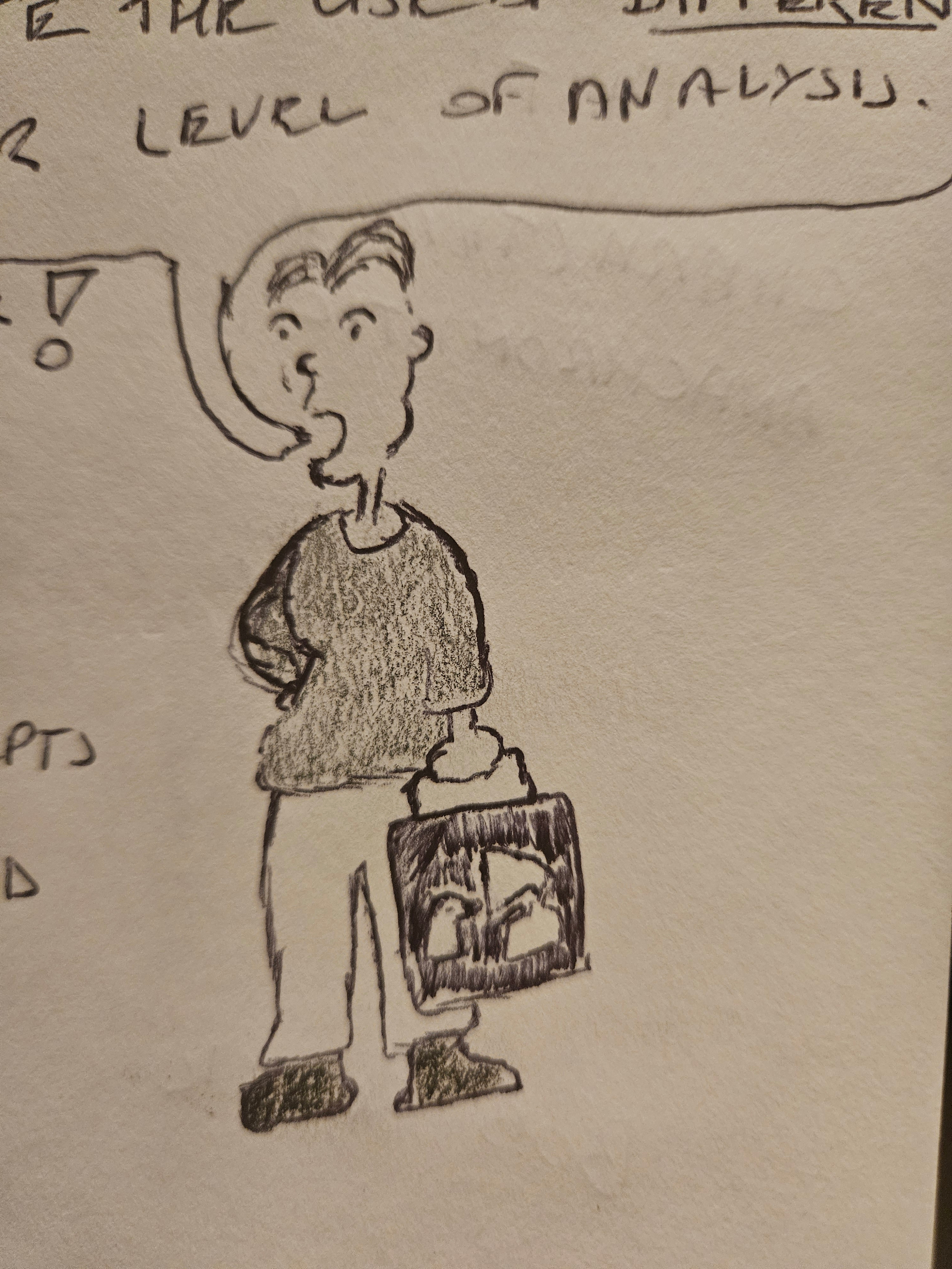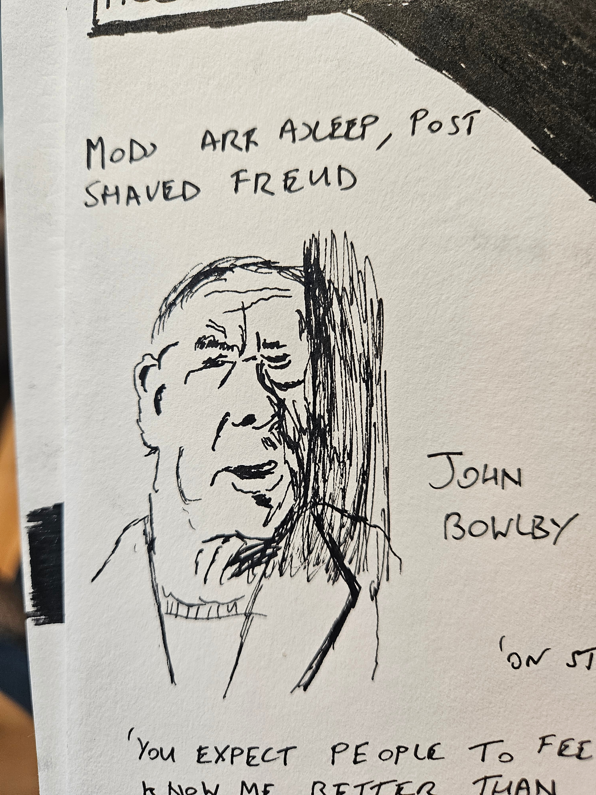 I do a lot of doodling when I’m making notes on the counselling course I’m doing. Here’s the window of the classroom, and a little guy with 90s hair carrying an HMV bag.