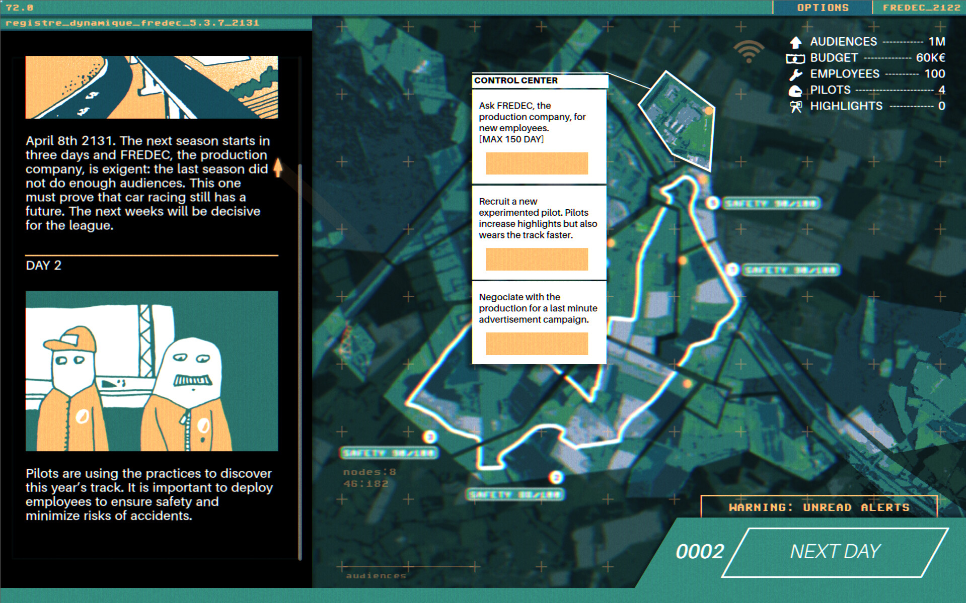Anyway what is it? you may ask. Well it’s easy to spoil so I’m gonna stay evasive, but first it’s a short game (1h15ish) about car racing and learning to let go. It takes place in a light futuristic management sim.