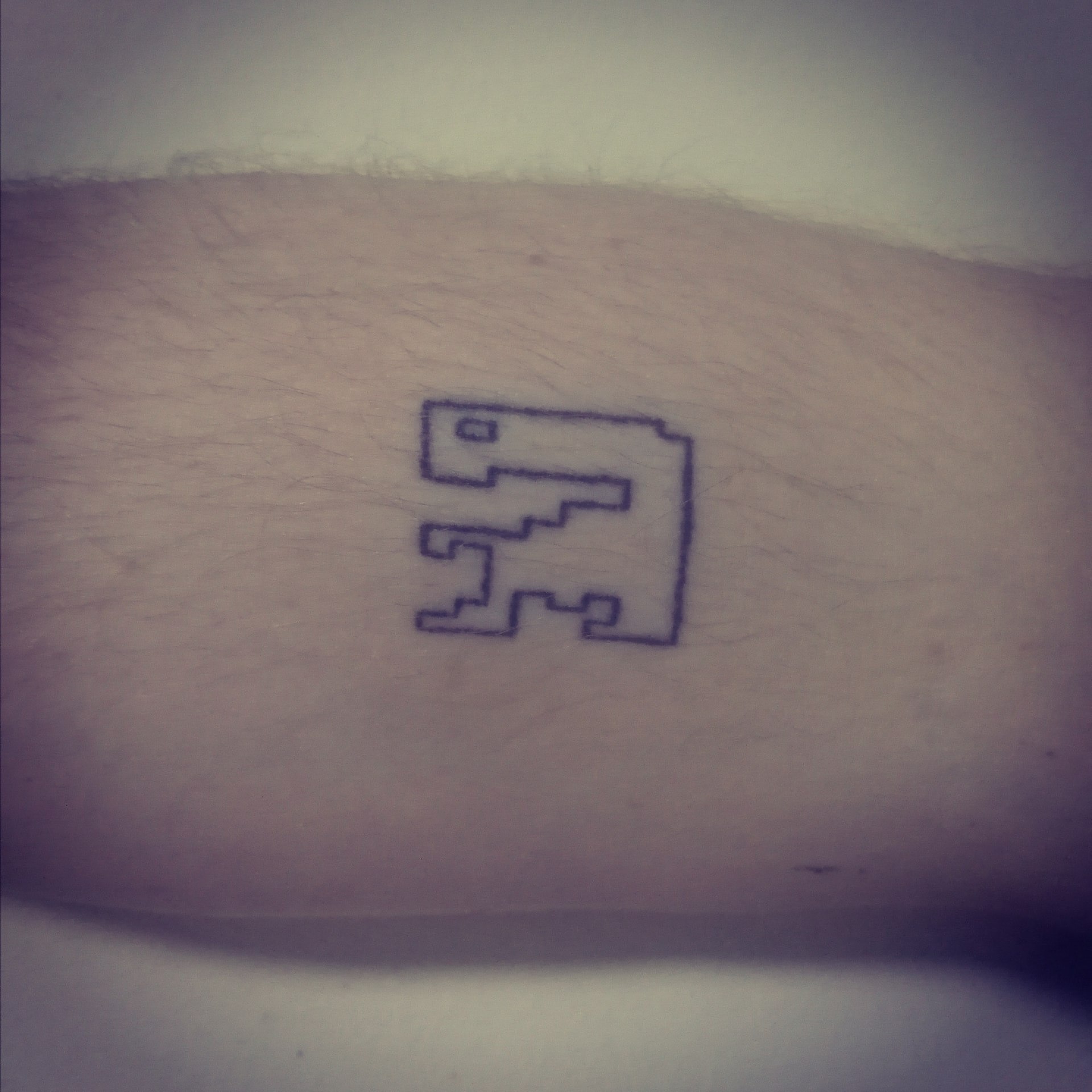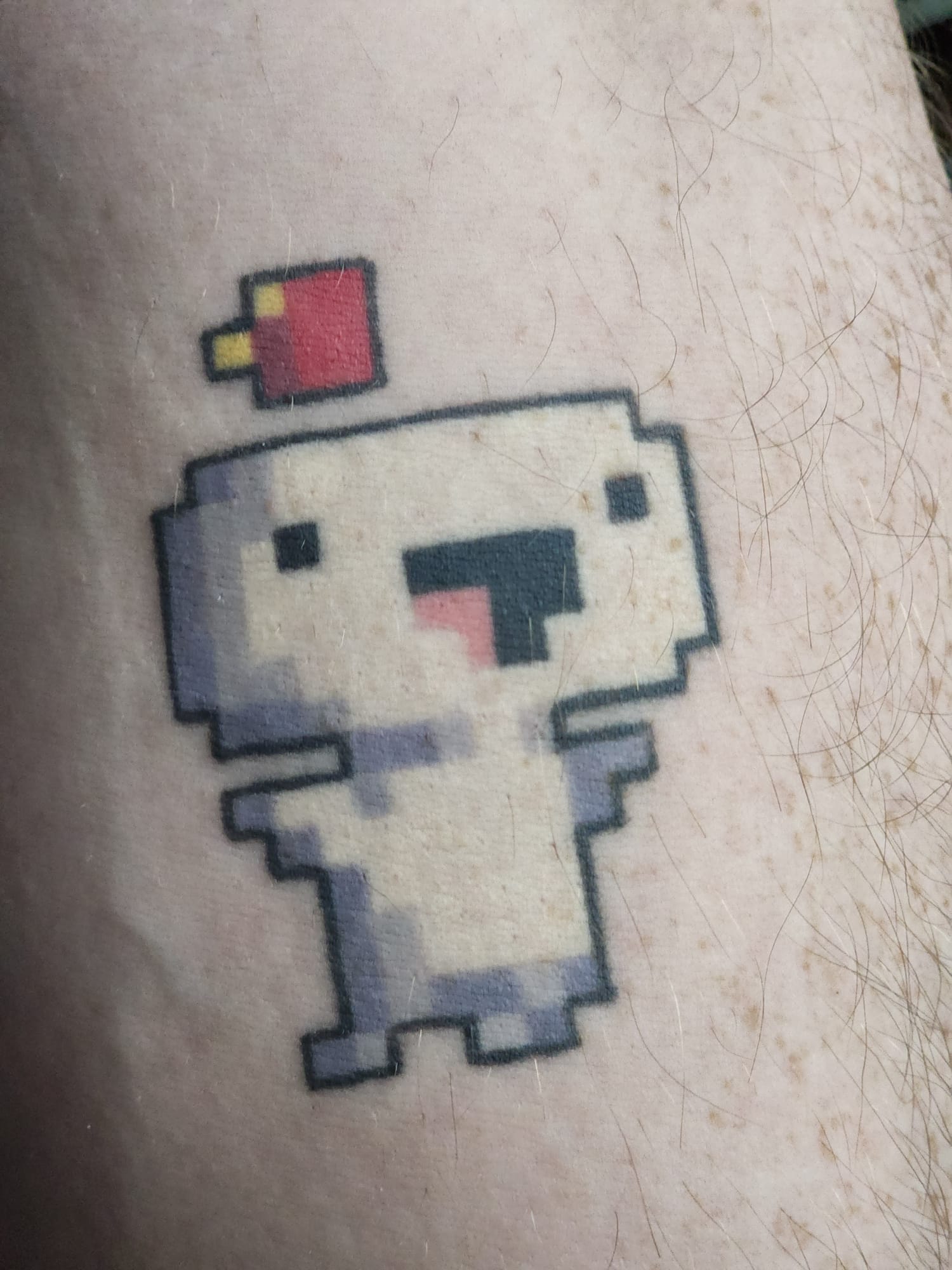 Forearm is the title character from my game Battery Acid Boy (and Battery Acid Boy 2!), and on my upper arm is Mustachio from L4D2 and the Las Plagas symbol from RE4 :)