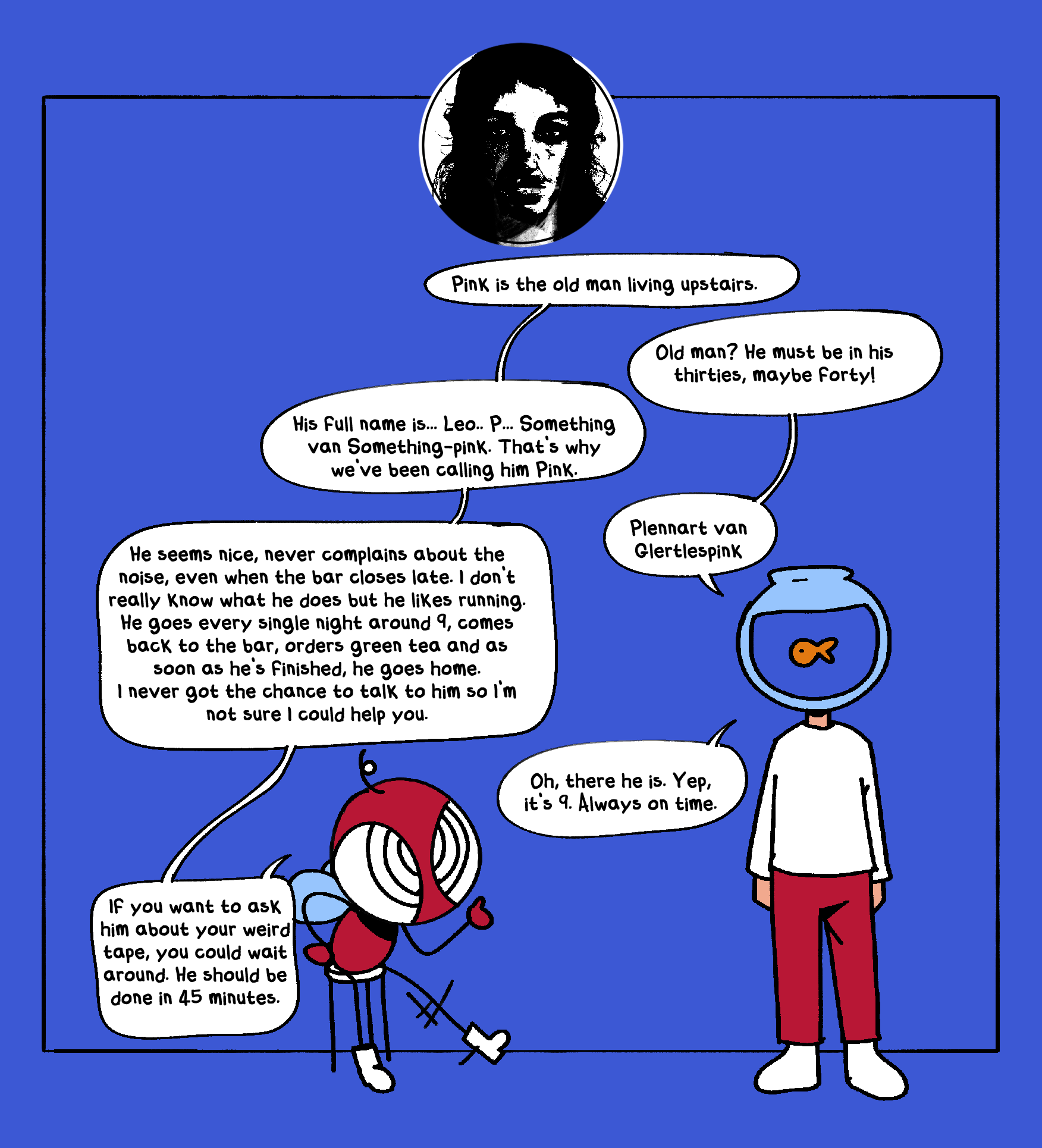 BASIL: He seems nice, never complains about the noise, even when the bar closes late. I don’t really know what he does but he likes running. He goes every single night around 9, comes back to the bar, orders green tea and as soon as he’s finished, he goes home.