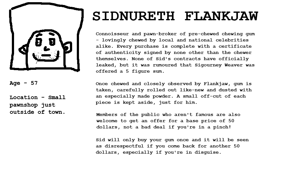 Connoisseur and pawn-broker of pre-chewed chewing gum - lovingly chewed by local and national celebrities alike. Every purchase is complete with a certificate of authenticity signed by none other than the chewer themselves. None of Sid’s contracts have officially leaked, but it was rumoured that Sigourney Weaver war offered a 5 figure sum.