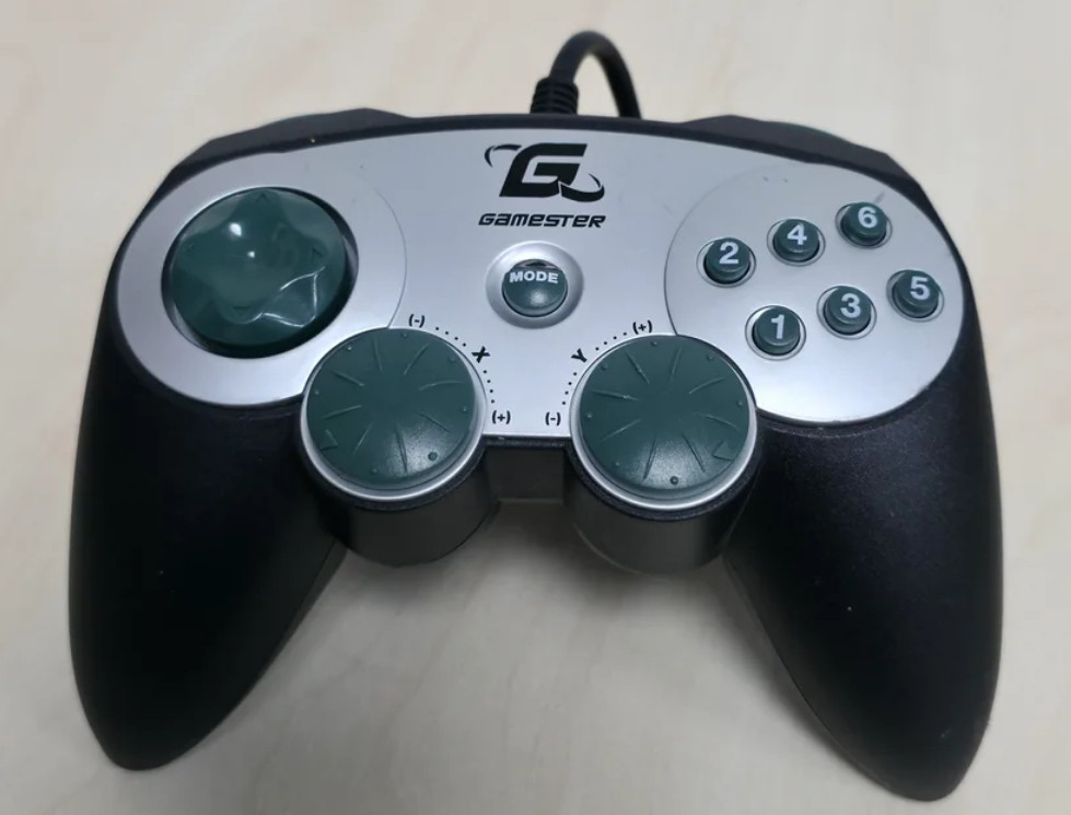 Gamester Evolution Pad for PC. You might think that the rotary dials could be used for something cool like a throttle and steering, but no. This controller has tilt motion controls and the dials are just for adjusting the sensitivity of the X and Y axes. It uses gameport and works on Win9x and DOS.