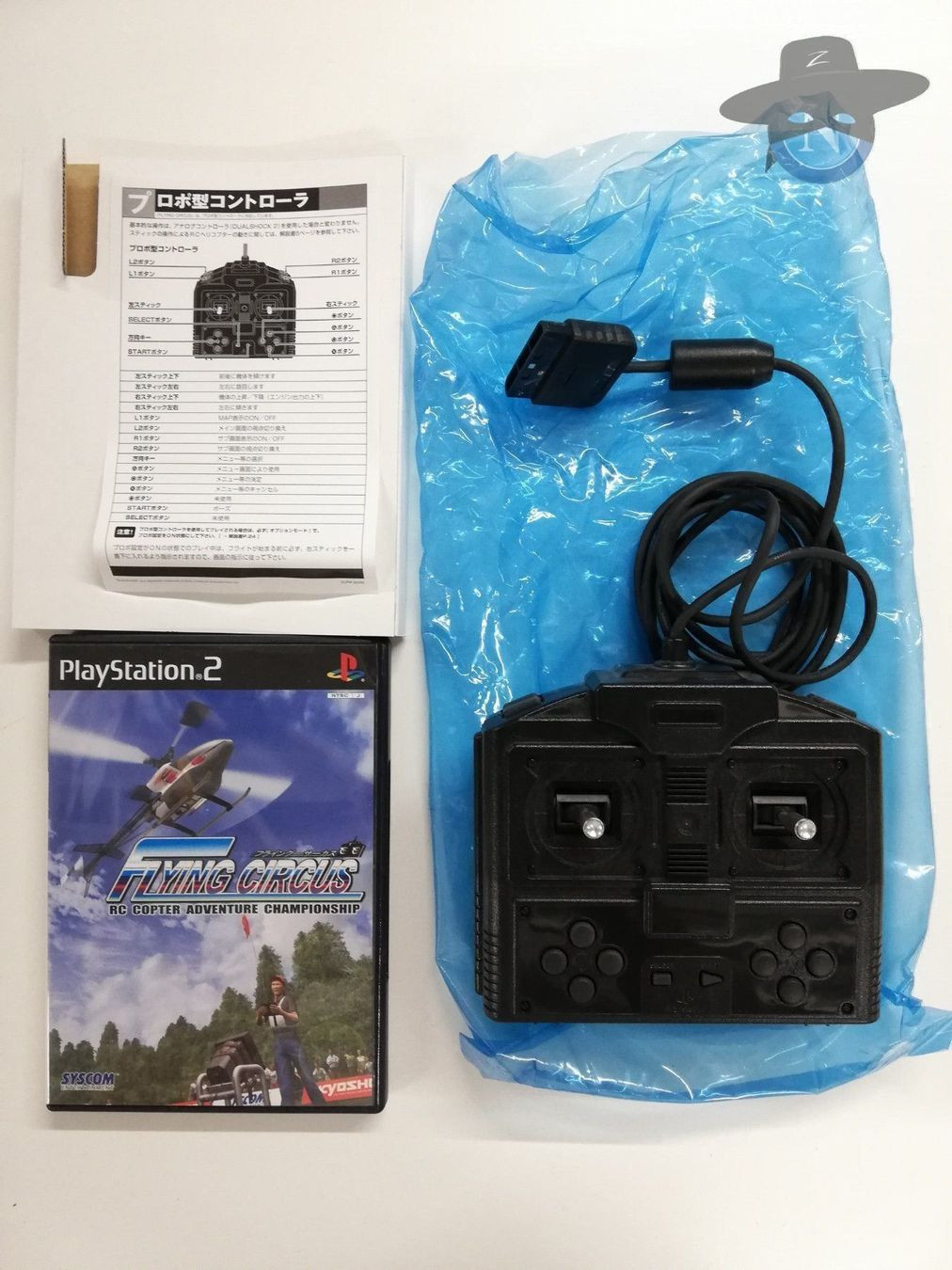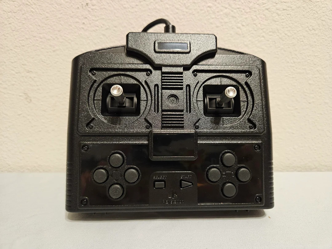 Flying Circus RC controller. Like a real RC controller but with enough buttons for all PS2 functions except L3/R3. All buttons are made of rubber. The left stick functions normally but the right can be set to different vertical positions and it won’t spring back to centre.