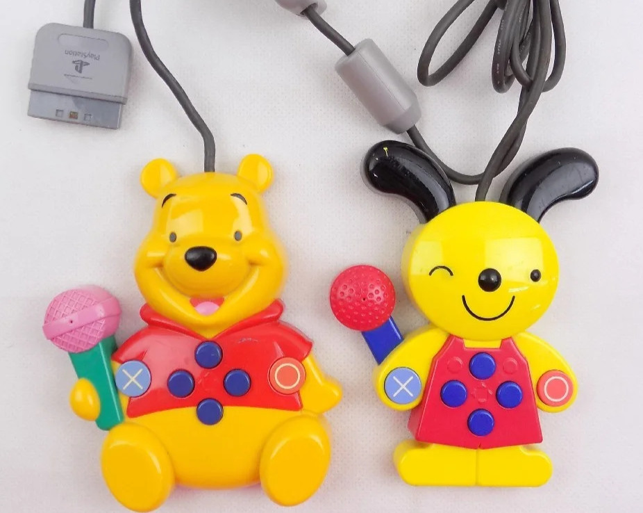 Kids Station Microphone controller for PS1. Kids Station is a series of many edutainment games in Japan. Testing one in emulator it seems just pressing L1 on a normal PS1 pad would activate any action needing the microphone, so I’m not convinced it can recognise specific words.